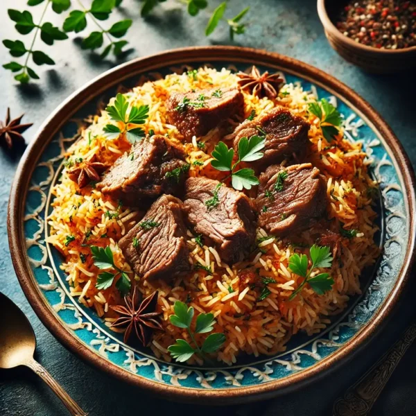 Tender lamb pieces cooked with basmati rice, garam masala, onions and bell peppers and nuts.